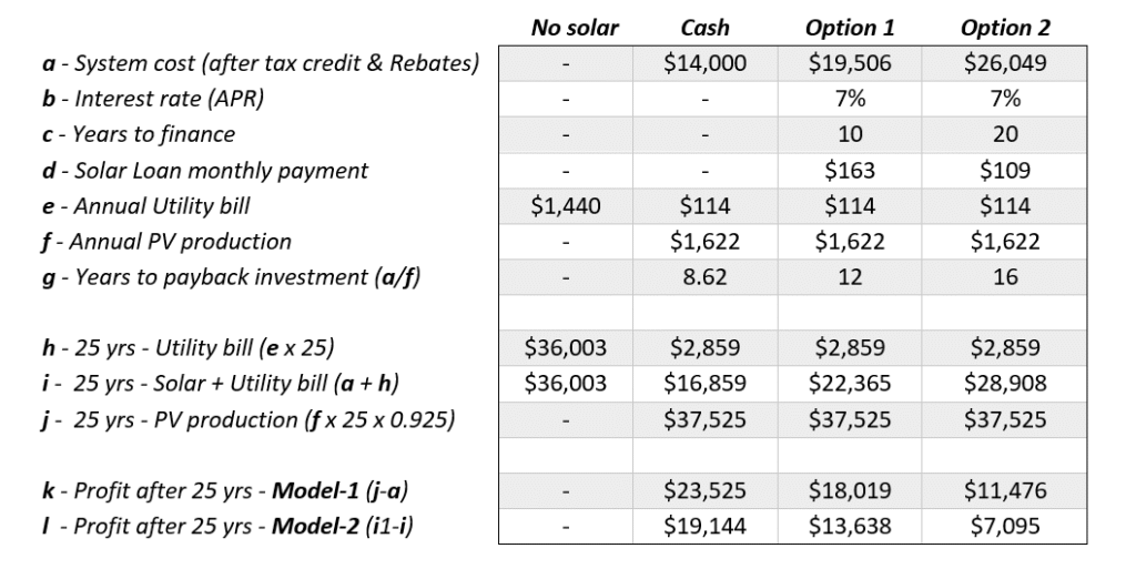 Again, using model-2 but financing the system for 20 years at 7% interest the system would cost $26,049. Following the same formula, the ROI would be $7,095. In other words, the PV system plus electric bill totals $28,909, then we subtract this number from the cost of electricity without solar PV and we get $7,095 ($36,003 – $28,908 = $7,095).
